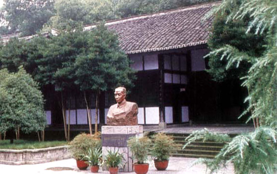 吳玉章故居位于榮縣東南,距縣城約15公里的金臺(tái)鄉(xiāng)蔡家堰村,今尚存土木結(jié)構(gòu)房屋三間,其中兩間有樓,占地面積96平方米。1958年,吳主章回縣,將舊宅捐贈(zèng)辦師范。1983年師范搬遷后,辦起蔡家堰中學(xué)(今名玉章中學(xué))。 1988年吳誕辰110周年,國家拔款,在緊連舊居之西重建吳玉章故居,整修至雙石鄉(xiāng)的道路,及蔡家堰大橋。修葺后的吳玉章故居,占地15500平方米,總建筑面積1050平方米。大門門楣懸掛國家主席楊尚昆的題匾“吳玉章故居”。門內(nèi)兩邊柱上刻有對(duì)聯(lián):“荊樹有花兄弟樂;書田無稅子孫耕。”院壩正中安放吳玉章半身雕像。雕像基座正面刻有中央軍委主席鄧小平的題詞:“我國杰出的無產(chǎn)階級(jí)革命家、教育家、歷史學(xué)家、語言文字學(xué)家吳玉章!被趁骊幙虆怯裾碌纳胶(jiǎn)介碑文,文字為繁體正楷。堂屋門楣懸掛徐向前元帥題寫的匾額“革命前軀”。